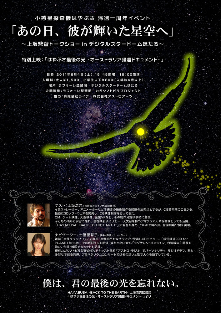 リゾートホテルラフォーレ琵琶湖とカガクノトビラプロジェクトは来る6月4日(土)、ホテル内併設のプラネタリウム「デジタルスタードームほたる」にて、小惑星探査機はやぶさ帰還1周年記念イベント「あの日、彼が輝いた星空へ」を開催いたします。