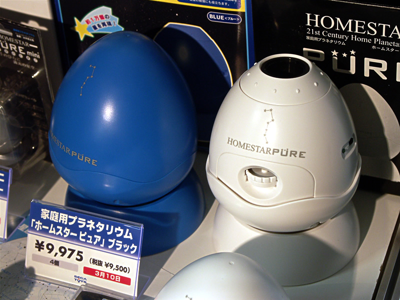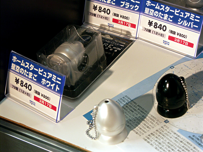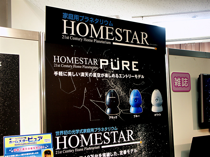 ピュアミニについては情報も含めて初登場ではないでしょうか。写真での大きさとお値段からおわかりになるかと思いますが、ピュアミニとはハンディホームスターのピュア版ですね。機能的には原板交換機能が省かれているようですが詳細は不明。私がちょっと覗いたところ、オリオン座がアップで見えた気が……?外周部もハンディより綺麗だった気が……?なにぶんぱっと見ただけでして、不確定情報ばかりで申し訳ありません(汗)。