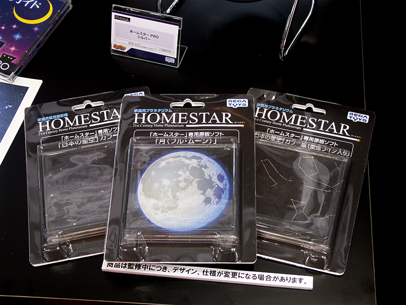 付属品は軒並みグレードアップしました。まずは何といっても気になるのが恒星原板、当然というかようやくというか?とにかくカラー化を果たしました。もちろん星座線なし/ありの2枚を標準で。そしてさらにスペシャルな原板、「月(フル・ムーン)」が付属します。これは一見するとNASAあたりが撮影した写真に見えるんですよ。そしてその満月の画像がホームスターによって天井に投影されるんです。でもですね、何か違うんです。ディティールがやたら細かくハッキリとしていて、リアルを飛び越してスーパーリアルなんです・・・。しかしてその実体はというと、何とあのKAGAYAさんが超精密に描いたCGが原本なんですって!これにはかなり驚かされましたねー。こちらも月以外のものを(もちろん別売りで結構ですので)ラインアップ希望です!