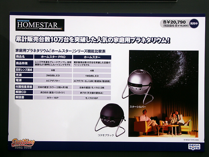 この春先より噂にはなっていたものの、その内容は秘密のベールに包まれていたホームスターの上位機種・・・。しかし2006年7月13日、東京ビッグサイトで行われている「東京おもちゃショー2006」のセガトイズブースにて、ついに公開されました。その名は「ホームスターPRO」!そしてその同梱物には何と我々カガクノトビラプロジェクトが関わっていたのです〜(大方の予想通り?笑)。というわけでカットビ!では一早くみなさんにそのレポートをお届けしたいと思います!